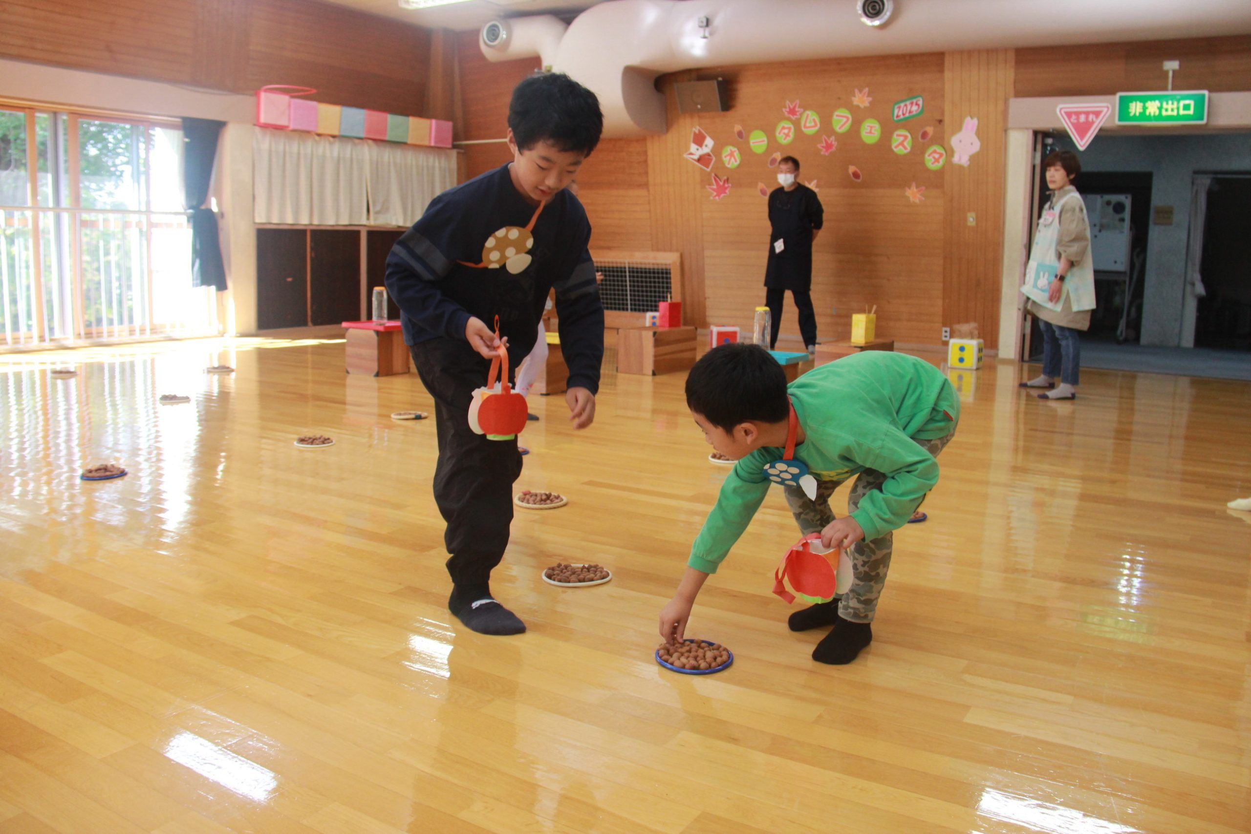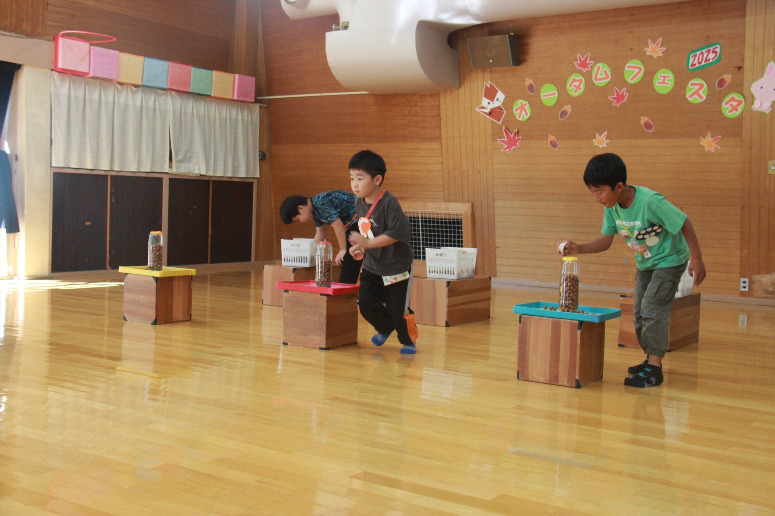 ゲームでは秋らしく、ドングリを使ったものを用意。「どんぐりいっぱいリレー」は、おちょこでドングリをすくい、ペットボトルが満杯になるまでドングリを入れ続けた。