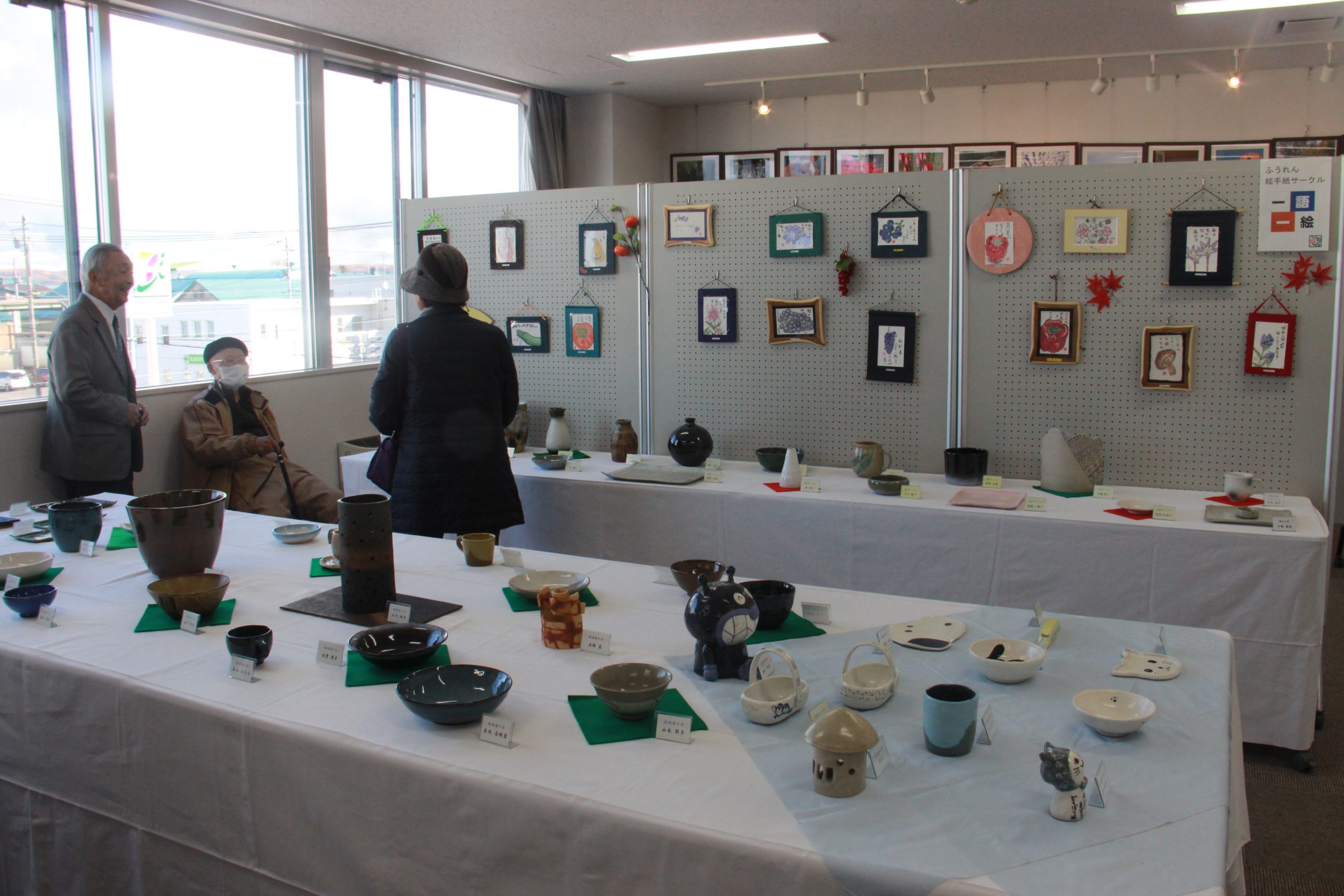 作品展示は2、3日に実施。同好会や愛好会による切り絵、俳句、書道、手芸、陶芸、墨絵、絵画、写真、絵手紙、生け花などを披露。特技や趣味を凝らした力作が並び、来場者たちがじっくりと鑑賞しながら、作者と語り合う様子も見られた。
