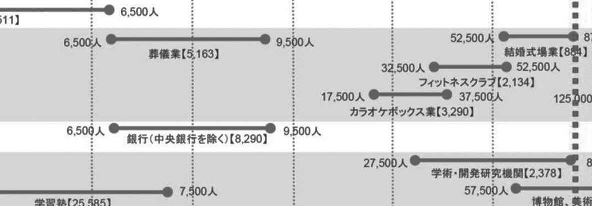 国土交通省は、「地域生活圏に係るデータ等」として「市町村人口規模別の施設の立地確率」をホームページ上で公表している。【図1】人口規模を最小の2000人未満から、最大の50万人以上まで11に区分して「小売」「宿泊・飲食サービス」「生活関連サービス」「金融」「学術研究、教育・学習支援」「医療・福祉」「対企業サービス」の7分野で、店舗や施設の設置、サービスの提供状況などを表している。