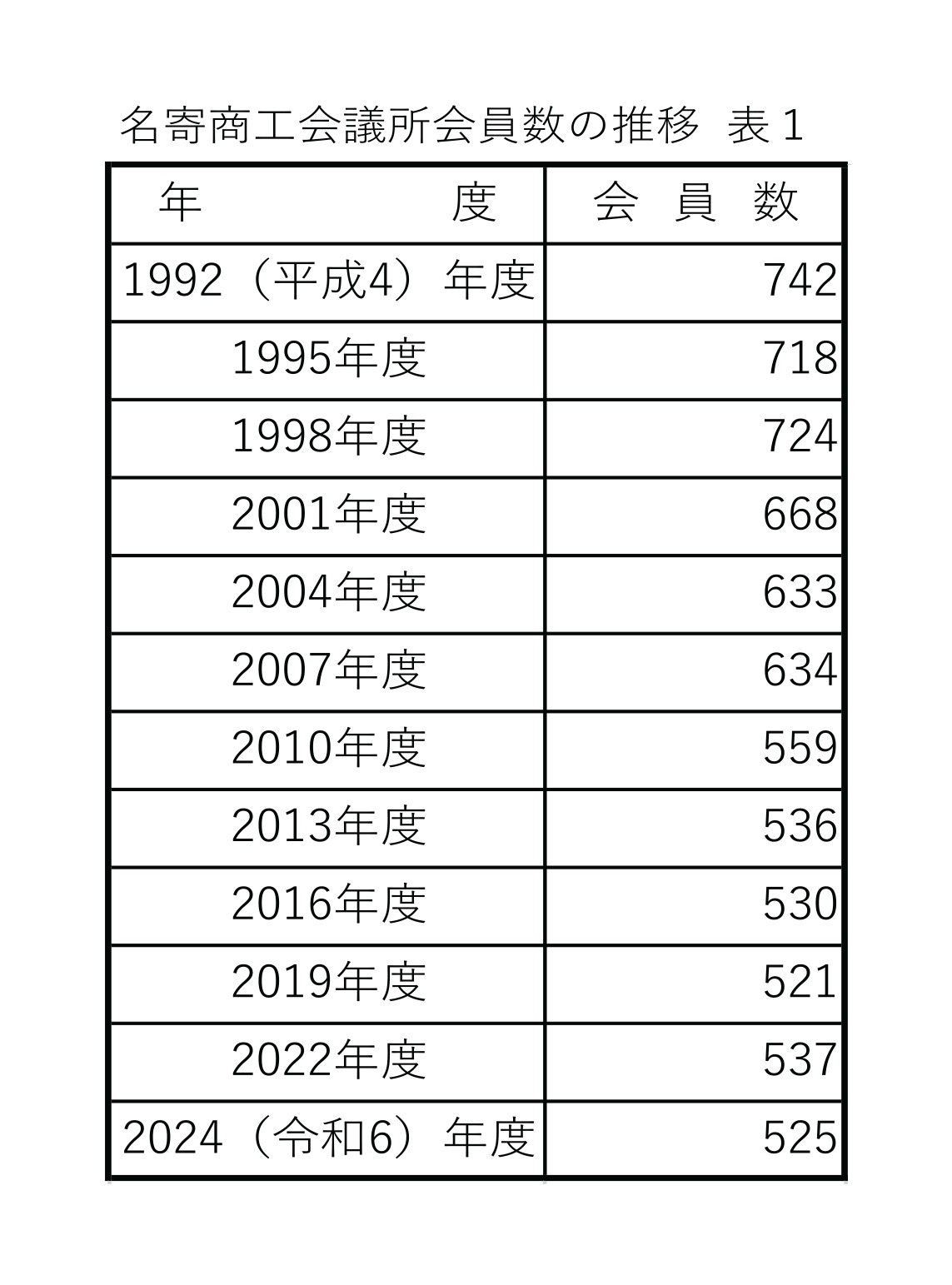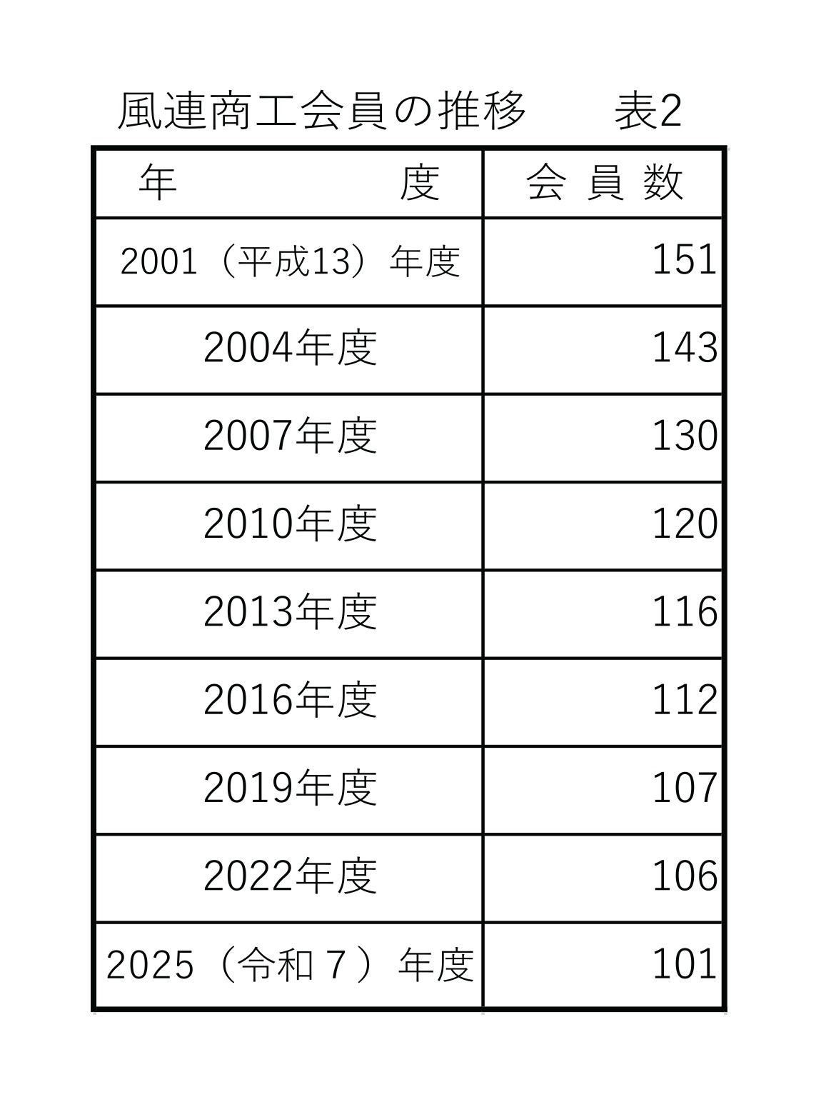 名寄商工会議所と風連商工会の会員数の推移の資料を提供してもらった【表1・表2】。