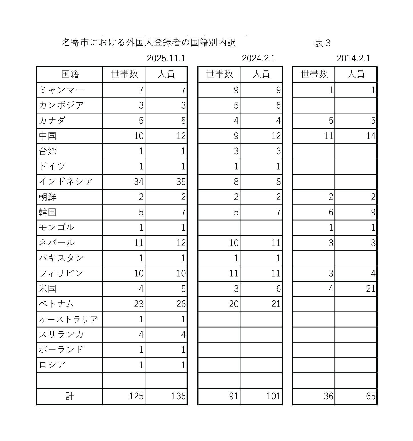 名寄市の外国人居住者の推移を【表3】にまとめた。2025年11月1日現在で、19カ国から135人が名寄市で働き居住している。近年は、ベトナム、インドネシア、ネパールなどの国籍者が増えており、介護、建設、農業などの分野で働く人が多い。10月には150人を超えていたので、4月~10月の農繁期の時期は、インドネシア人を中心にさらに多くの外国人が暮らしている。