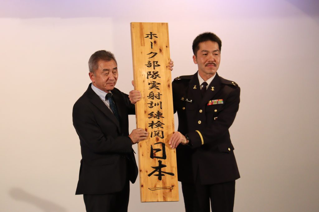 金塚支部長から世増第315高射中隊長に日本一獲得の看板が贈られた。