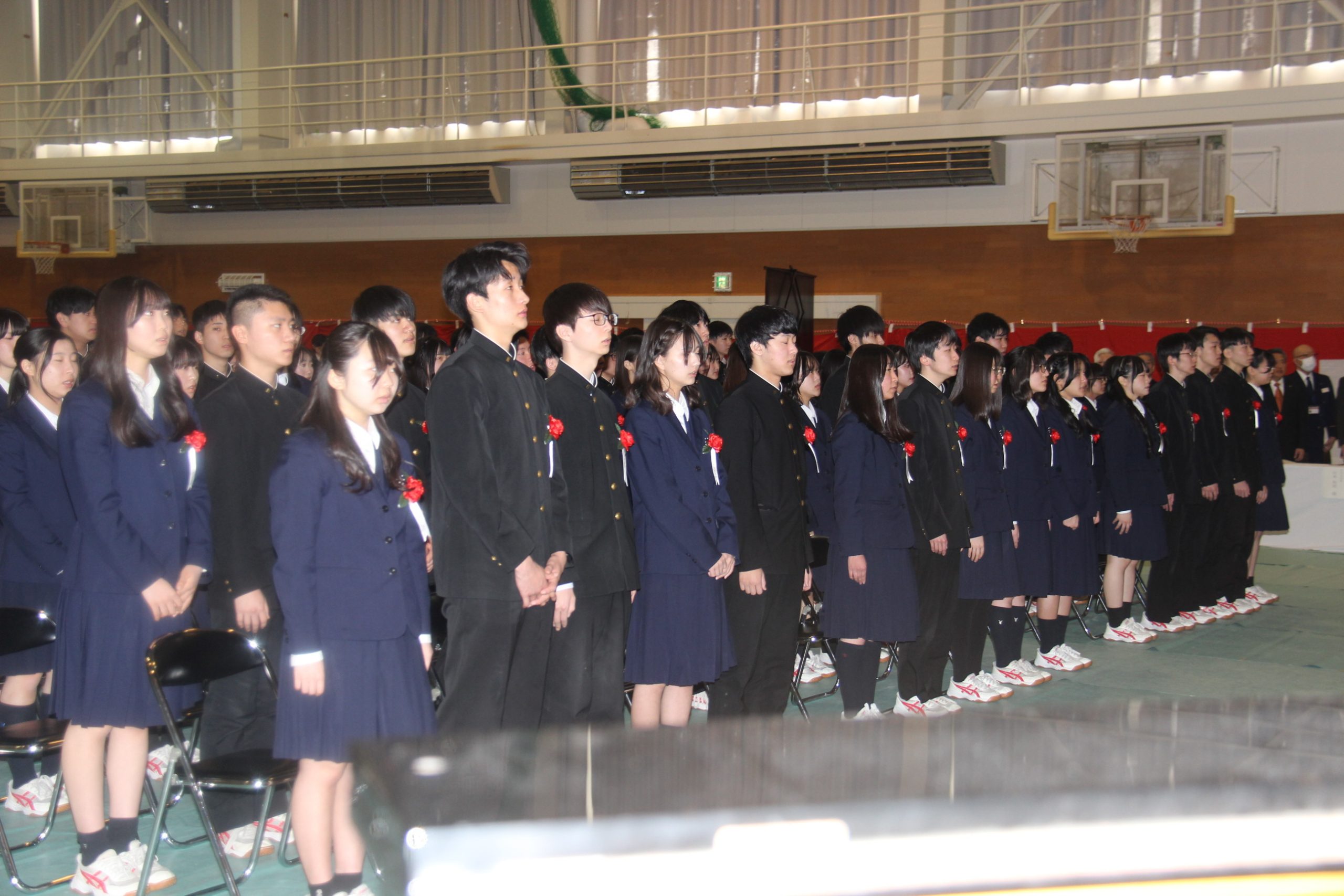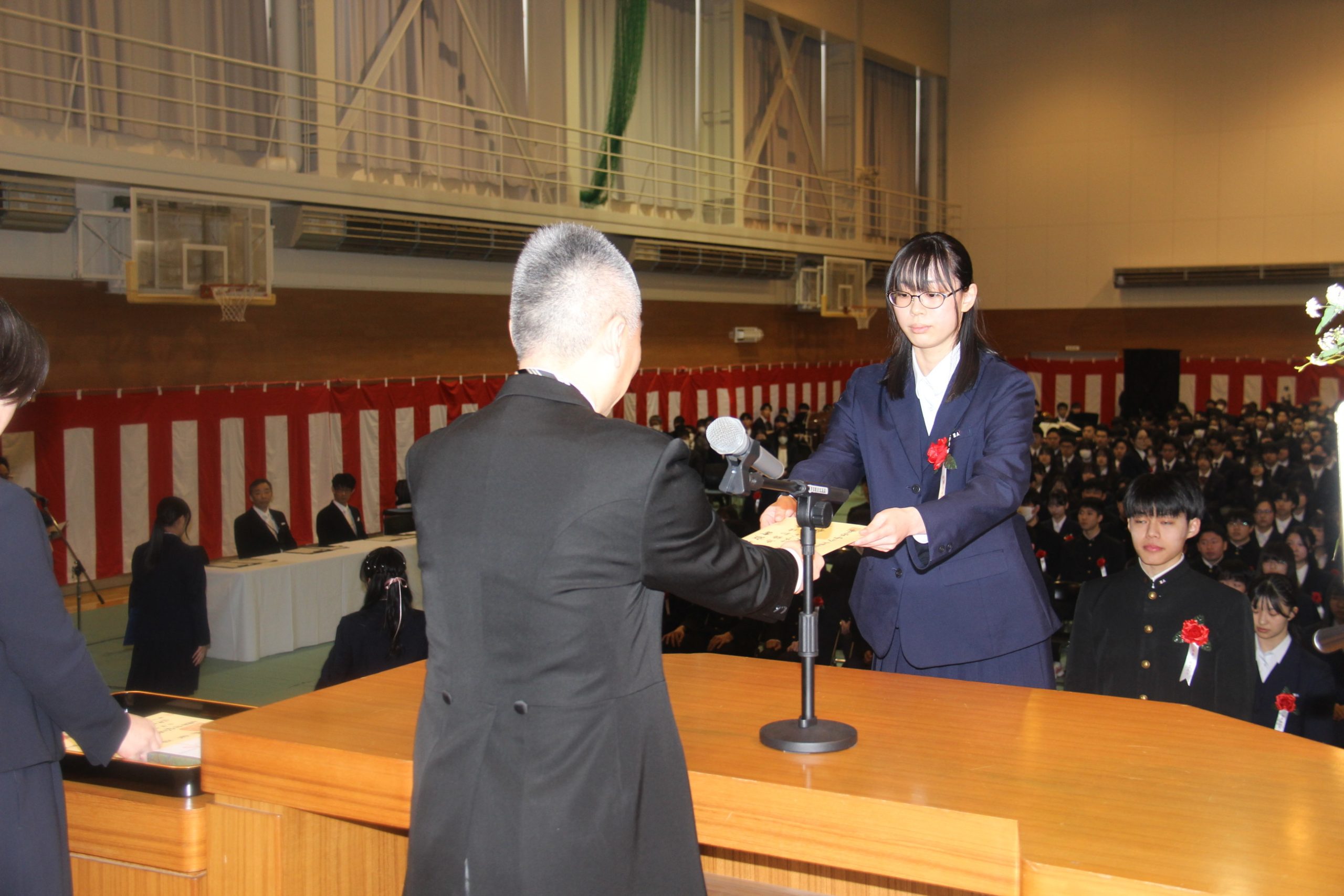 卒業生を代表して久光紗季さん(前生徒会長)が「ここでしかできない経験がたくさんできた。3年間はあっという間だったが、無駄な時間はなく、全てが成長できる大切な時間だった。家族や先生、仲間たちの数えきれない支えによるものであり、感謝している。これからも自分の道を精いっぱい進みたい」などと答辞を述べ、卒業後の新しい生活へ期待に胸を膨らませながら思い出の詰まった学び舎を後にした。