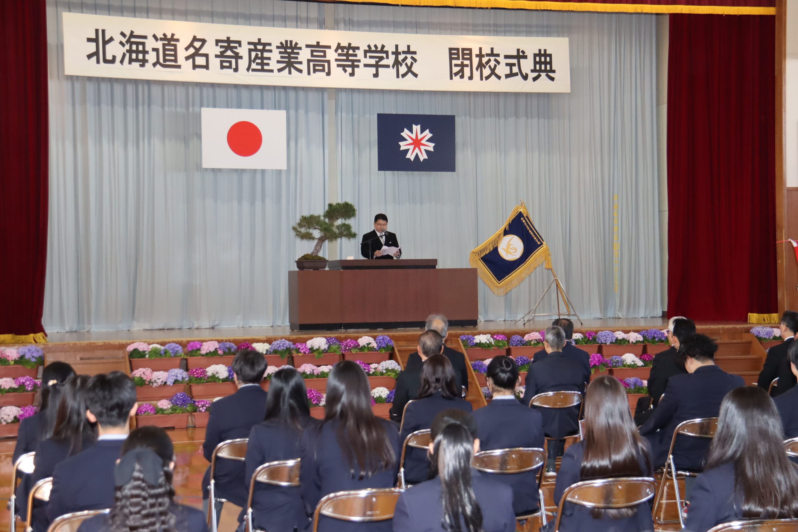 八丁校長が「各学科での学びを通じた活動では、さまざまな大会で優秀な成績を収めた他、歴代受け継がれてきた伝統ある教育活動を着実に実践してきた。いつの時代になっても、どんなに厳しい状況にあっても、本校にはいつも明るい生徒の笑顔を懸命に支え育てようとする教職員の姿、そして本校を見守りご協力いただいた保護者や卒業生、地域の皆さまがいてくださった。これまで生徒を支え育んでいただいた地域の皆さま、ご指導いただいた北海道教育委員会、名寄市、歴代校長先生、旧職員、保護者の皆さまに感謝申し上げたい」と式辞。