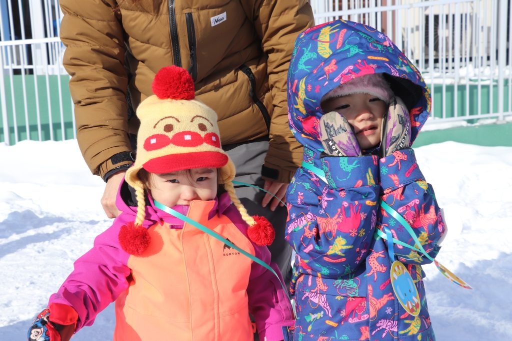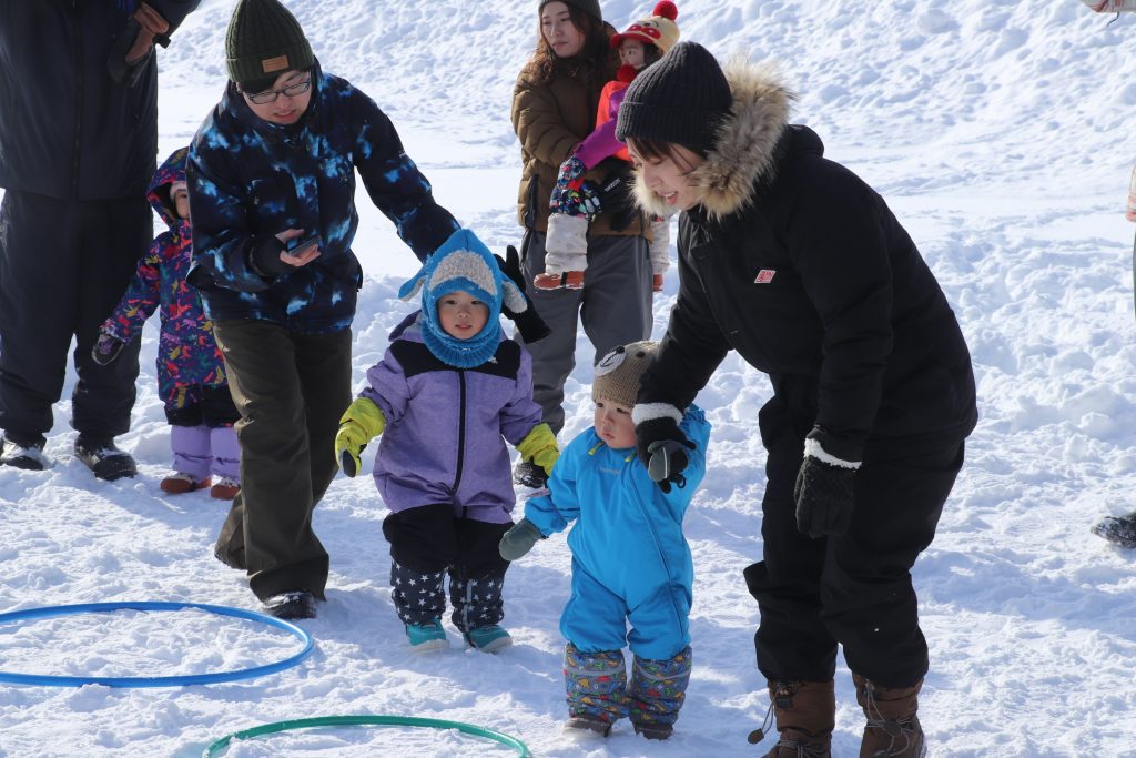 最初に全員で「アンパンマンたいそう」を実施。その後、「そり引き競走」「フラフープ取り」「玉入れ」「宝探しゲーム」の四つの雪遊び(ゲーム)を楽しんだ。