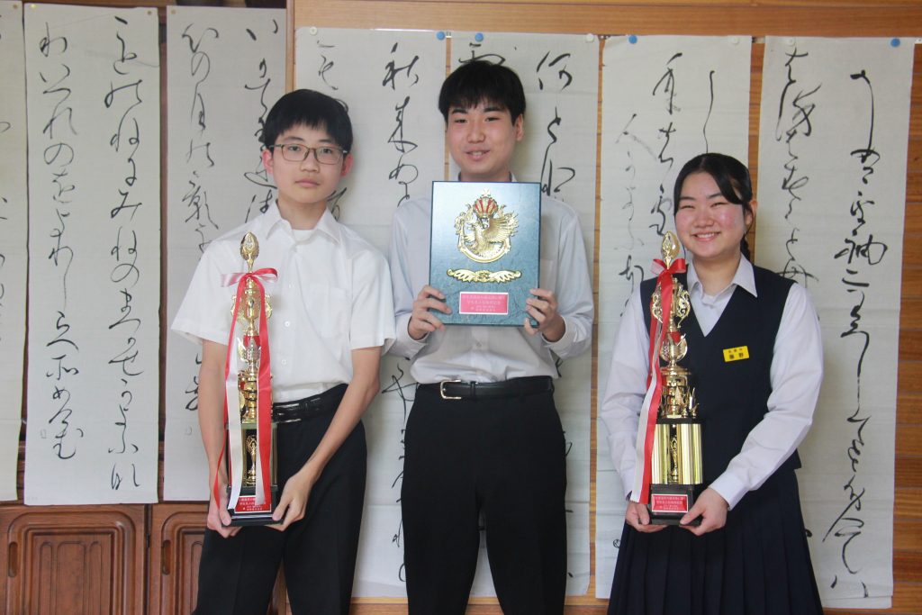 日本書道評論社「書の研究」の2025年度前期昇段級試験で、書心書道教室に通う藤野琴羽さん、高田想さんが毛筆の部、田代優斗さんが硬筆の部で、中学生が取得できる最高位となる「学生名人」に合格。喜びの表情を見せている。