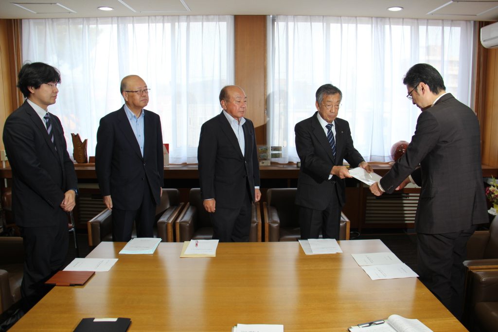 名寄地方創生会議の座長を務める藤田健慈名寄商工会議所会頭は、10月30日午後1時半に市役所名寄庁舎を訪れ、地方創生を推進するための取り組み内容などをまとめた提言書「名寄市の未来は選択できる~産学官で挑む、人口定常化へのチャレンジ~」を加藤剛士市長に提出した。