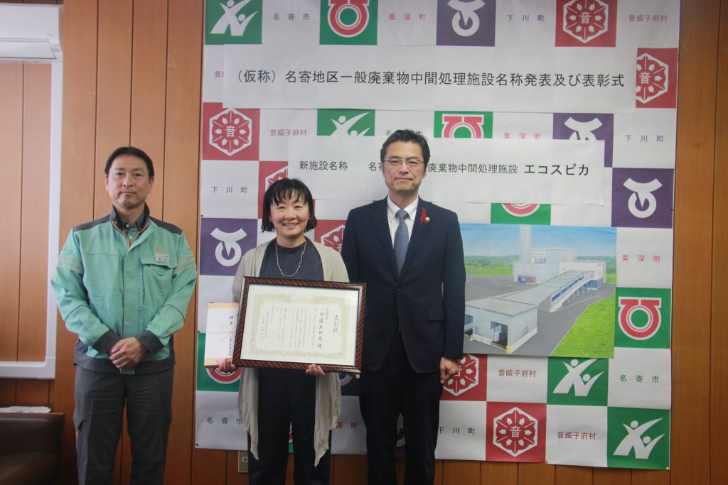 2027年4月から供用開始予定の(仮称)名寄地区一般廃棄物中間処理施設の名称が決定。下川町在住の田邊真理恵さんが名付けた「エコスピカ」が採用された。名称の発表と表彰式が、8日午後1時半から市役所名寄庁舎で行われた。